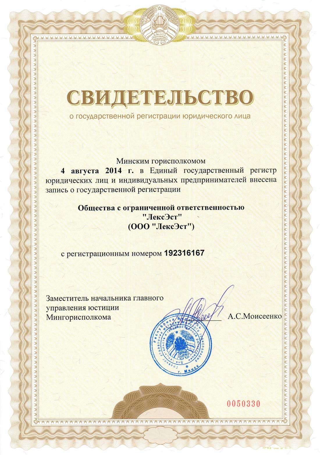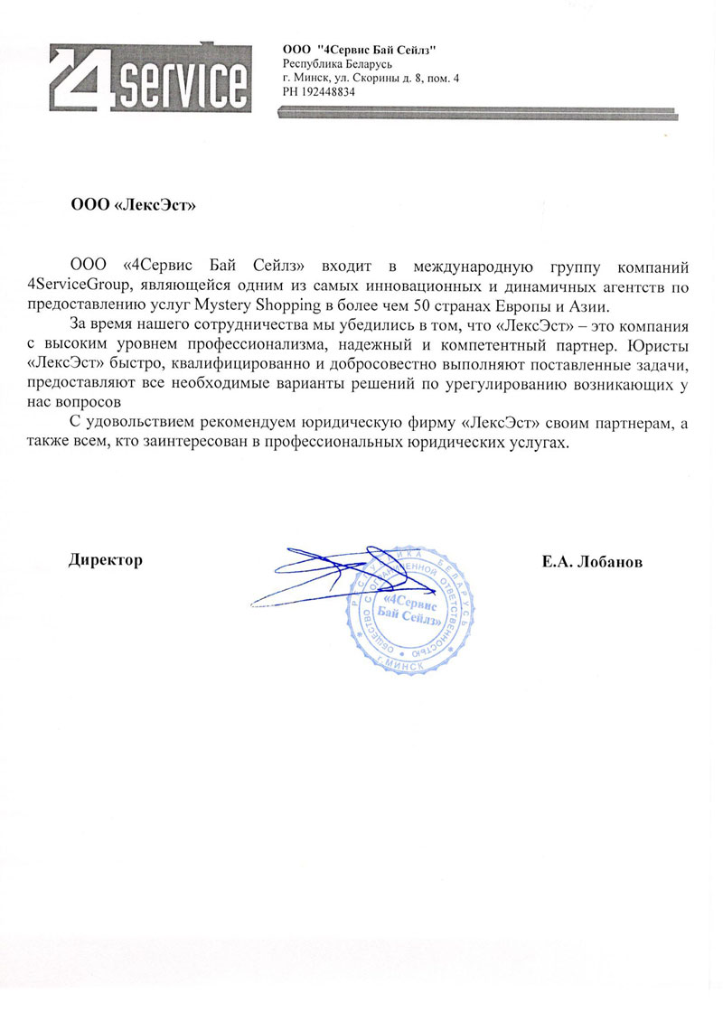 СООО "Микро Экспресс Интл'л" выражает глубокую признательность агентству бизнес-услуг ООО "ЛексЭст" за высокое качество и оперативность оказываемых услуг.