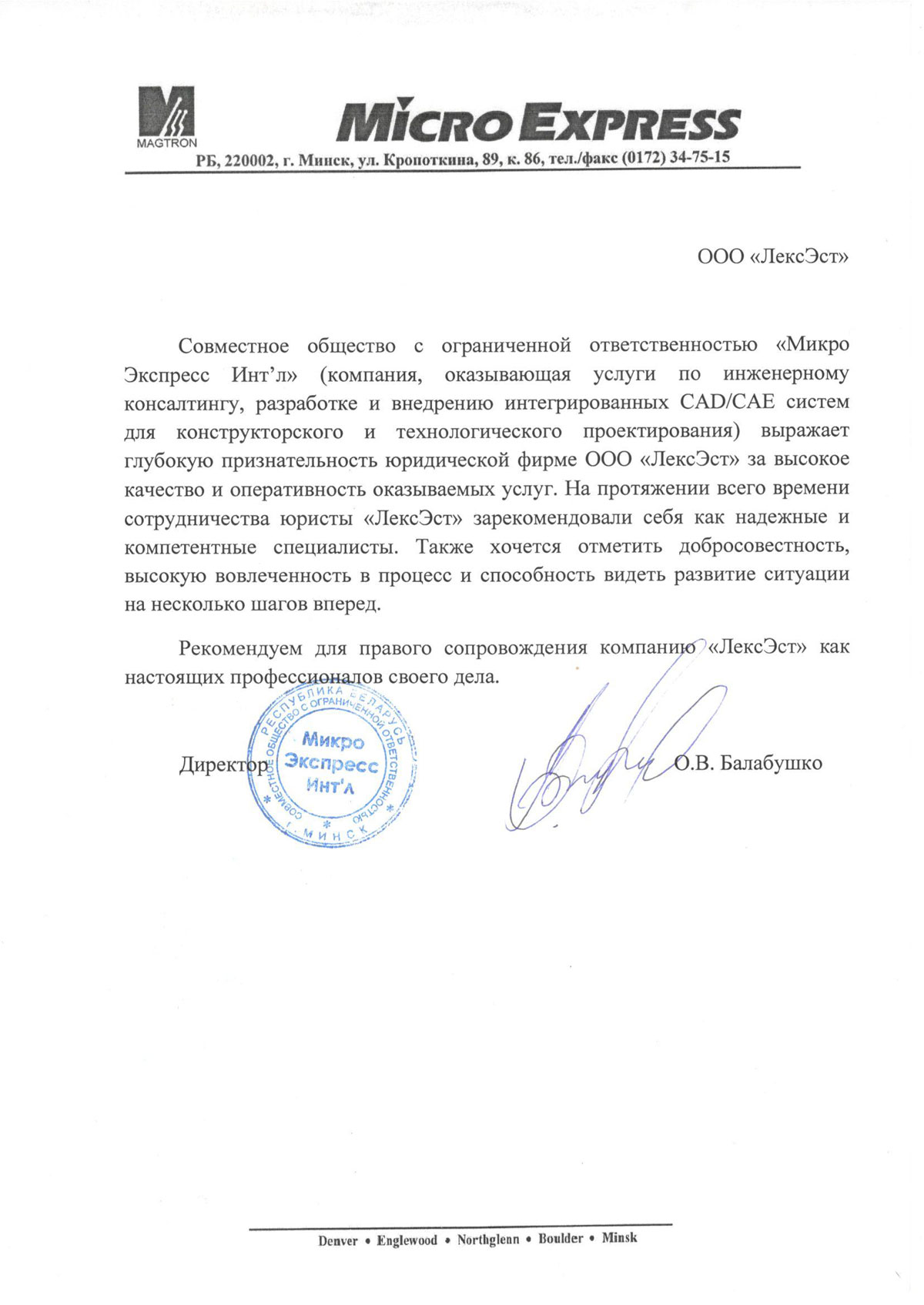 СООО "Микро Экспресс Интл'л" выражает глубокую признательность агентству бизнес-услуг ООО "ЛексЭст" за высокое качество и оперативность оказываемых услуг.