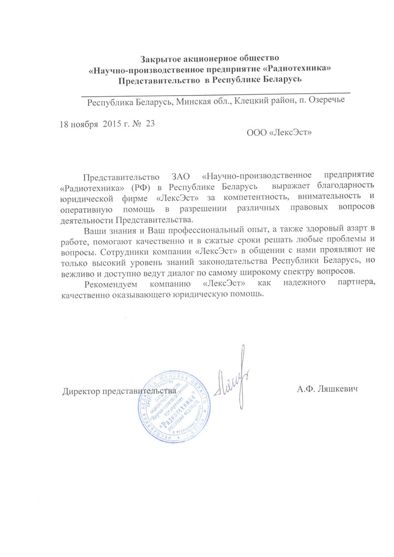 Представительство ЗАО «Научно-производственное предприятие «Радиотехника» в РБ выражает благодарность юридической фирме "ЛексЭст" за компетентность, внимательность и оперативную помощь в разрешении правовых вопросов деятельности Представительства